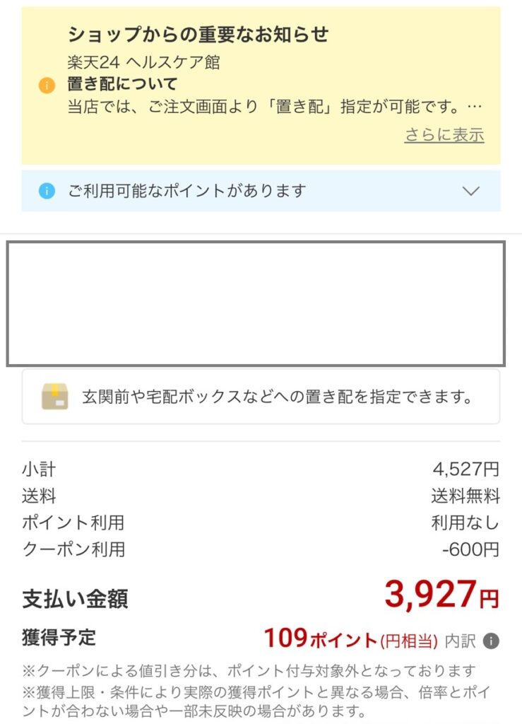 楽天では、4,527円!さらにクーポン600円が付いたので、3,927円に109ポイントがつき、